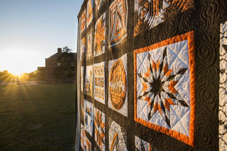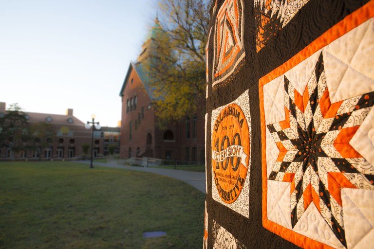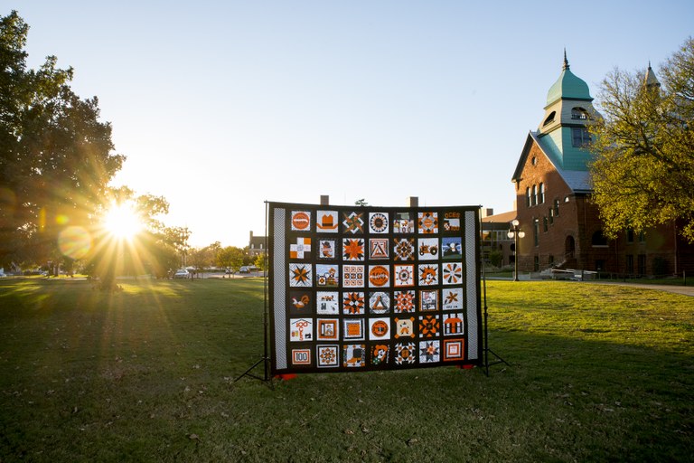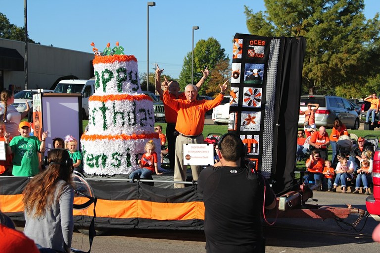 • As part of its debut in the fall of 2014, the quilt appeared in the Oklahoma State University Homecoming Sea of Orange Parade with James Trapp, associate director of Extension. -