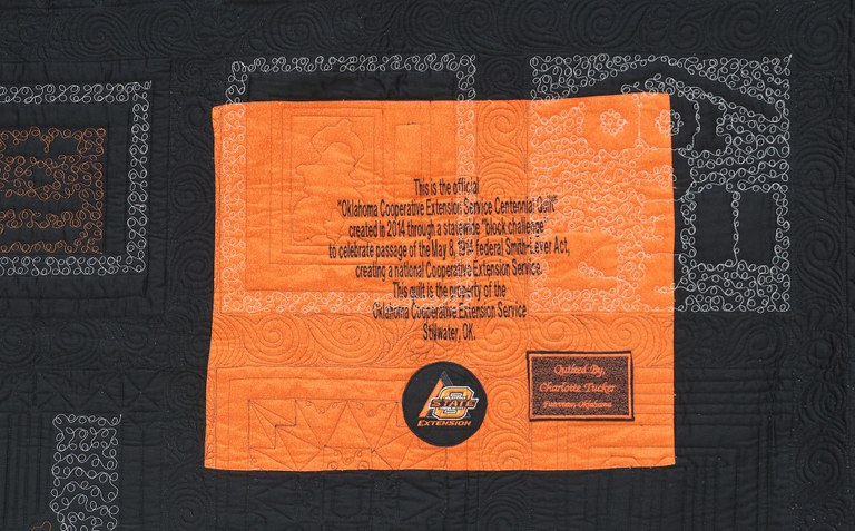 • Quilt Back - This patch on the back of the centennial quilt acknowledges the occasion and purpose of the project along with Extension’s logo and acknowledgement of the quilter, Charlotte Tucker of Fairview, Oklahoma.