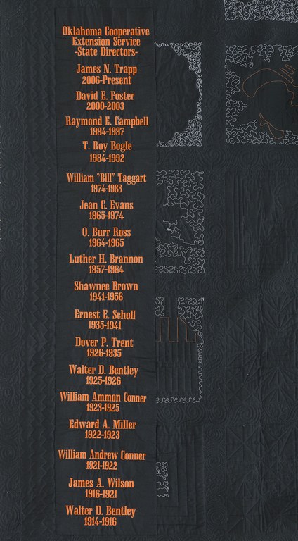 • Quilt back past directors - A list of the names and tenures of every state Extension director in Oklahoma is monogrammed on the back of the centennial quilt.