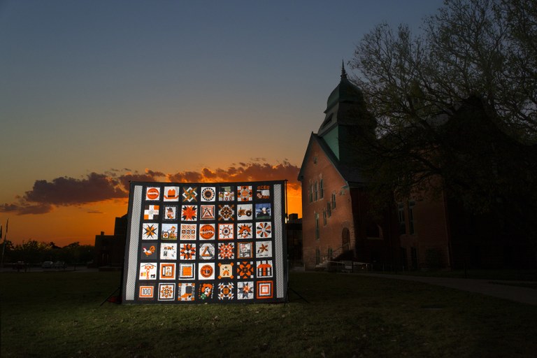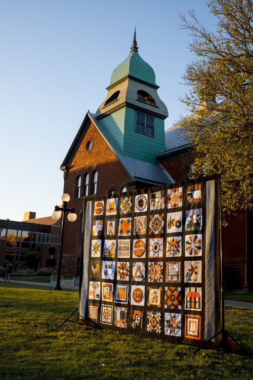 The quilt in front of historic Old Central on the OSU campus in Stillwater.