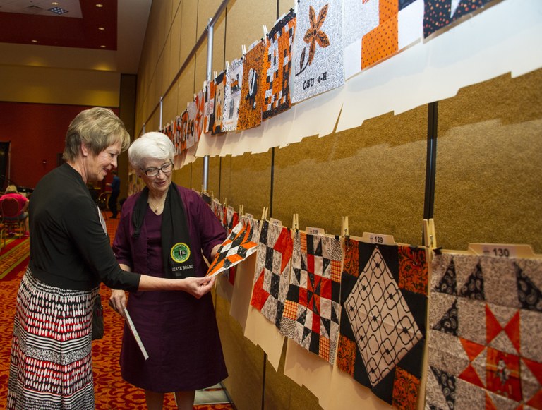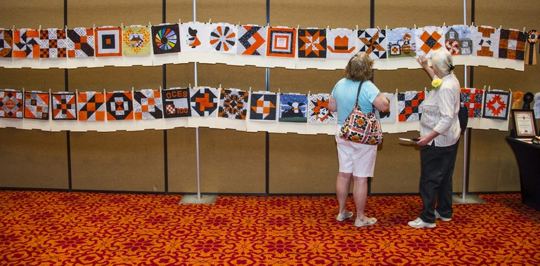 Members of Oklahoma Home and Community Education take time during their state meeting in July to view quilt block challenge entries.
