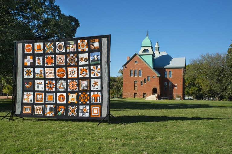 The official centennial quilt is displayed near Old Central, an historic building on the OSU campus in Stillwater.