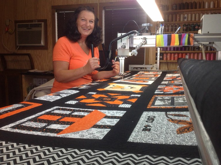Charlotte Tucker, who was chosen as the quilter for the centennial quilt project, uses a freehand long-arm sewing machine.