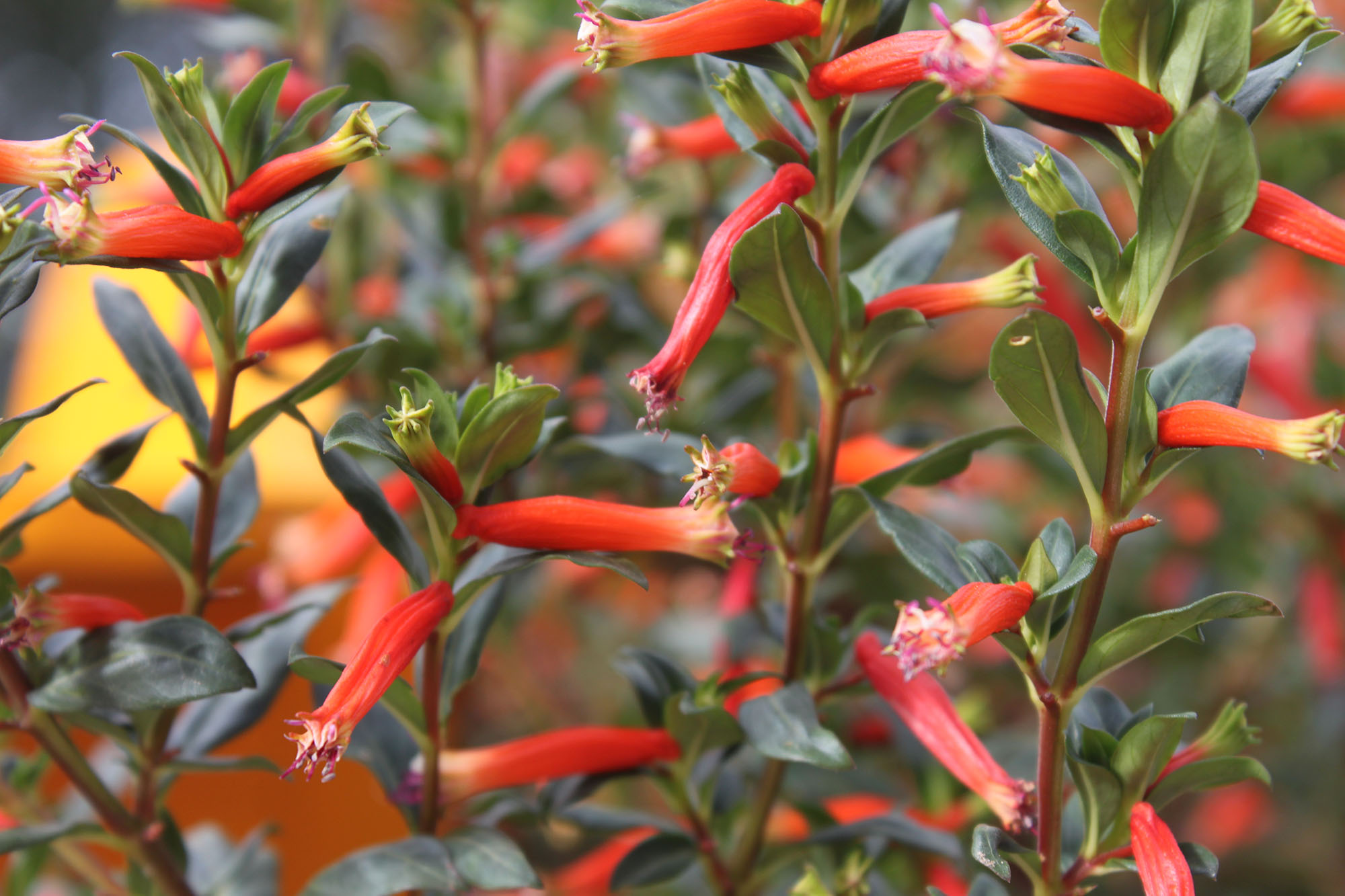 Cuphea is a genus of many plants native to the warm temperate and tropical regions of the Americas. Depending on the species and cultivar, they go by several common names such as firecracker plant, cigar flower, Mexican-heather, bat flower, bunny ears, candy corn plant, and false heather. Cuphea is a tender perennial grown as an annual in Oklahoma. It is low maintenance and is known for its tolerance to heat and drought. Plant foliage is bright green to blue-green and typically glossy. Although flowers are small, they are abundant and provide a spectacular show all summer long with no need to deadhead. Plants come in a variety of forms with a variety of flower colors and forms that are vivid and produce a sweet nectar that attracts hummingbirds, butterflies and other pollinators. Some of the more popular types include firecracker plant (C. ignea), Mexican-heather (C. hyssopifolia), bat-faced cuphea (C. llavea), and candy corn plant (C. micropetala) along with many hybrids.